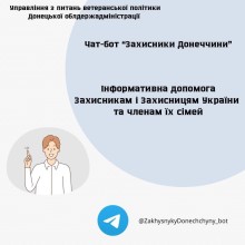 У Телеграмі працює чат-бот «Захисники Донеччини», який надає інформативну допомогу Захисникам і Захисницям України та членам їх сімей у режимі онлайн.