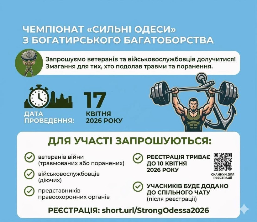 Запрошуємо ветеранів війни та військовослужбовців долучитися до участі у Чемпіонаті «Сильні Одеси» з богатирського багатоборства.