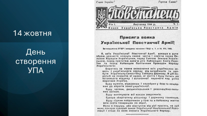 Офіційна дата створення Української повстанської армії (УПА) — 14 жовтня 1942 року, встановлена рішенням ОУН(б) і пов’язана зі святом Покрови. Деякі історики вважають цю дату умовною, вказуючи на поступове формування УПА з весни 1942 року, але 14 жовтня залишається символічною датою заснування армії.