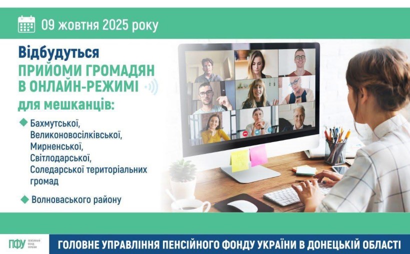 09 жовтня 2025 року з 11:00 до 12:00 фахівці Головного управління Пенсійного фонду України в Донецькій області проведуть онлайн-прийом громадян.