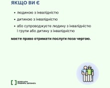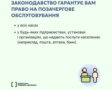 Люди з інвалідністю мають право на позачергове обслуговування у медичних закладах, банківських установах, у громадському транспорті, магазинах, державних установах та інших організаціях, що надають послуги населенню.