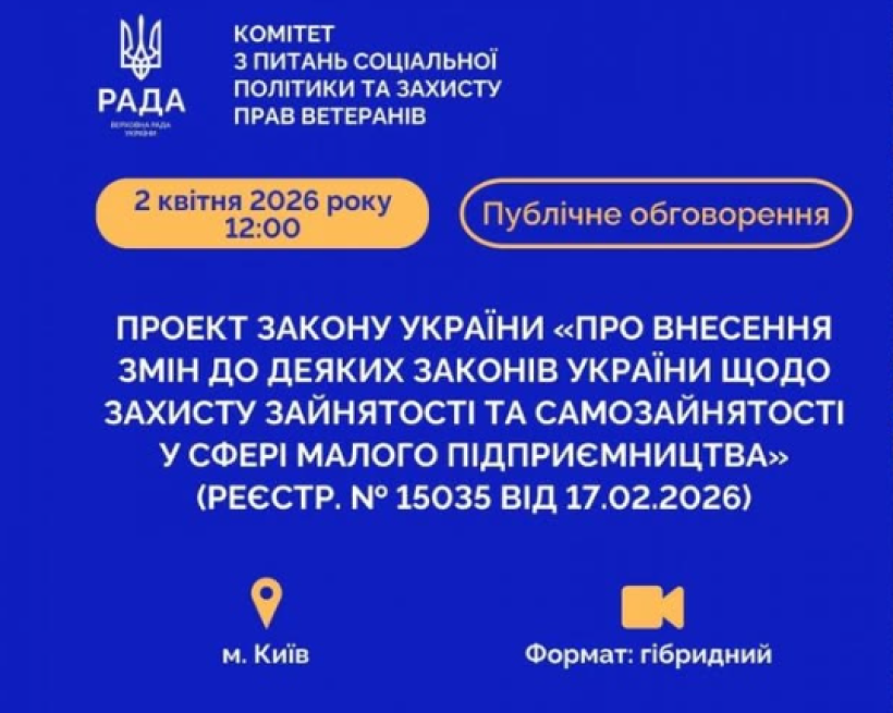 Комітет Верховної Ради України з питань соціальної політики та захисту прав ветеранів планує провести 2 квітня 2026 року об 11:00 публічне обговорення проєкту Закону України «Про внесення змін до деяких законів України щодо захисту зайнятості та самозайнятості у сфері малого підприємництва» (реєстр. № 15035).