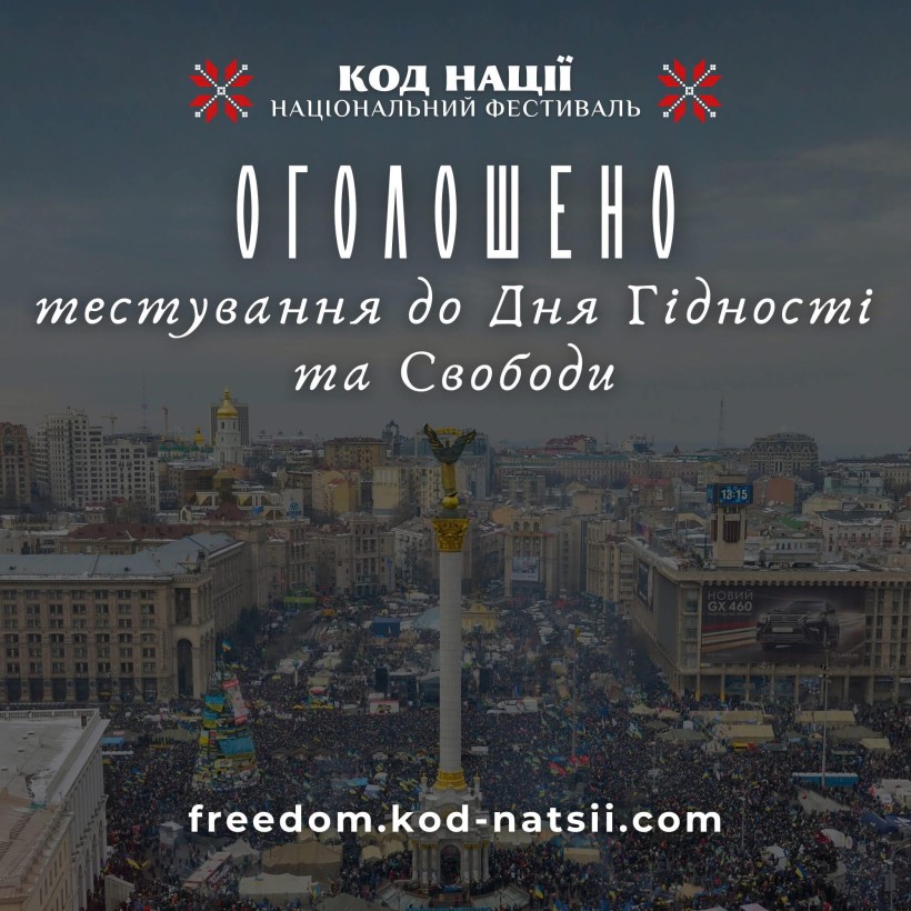 Освітньою платформою Національного Фестивалю “Код Нації” оголошено проведення Тестування до Дня Гідності та Свободи, яке покликане поглибити розуміння учасниками історичної значущості Революції Гідності, стимулювати інтерес до вивчення української історії та формування свідомої громадянської позиції в сучасному українському суспільстві. Методичне забезпечення
