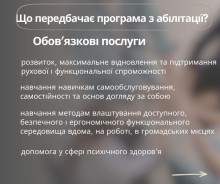 Абілітація спрямована на відновлення побутових навичок, автономності, психологічну реінтеграцію, професійну переорієнтацію тощо.