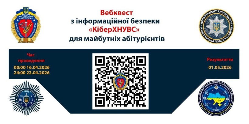 З 03 квітня по 11 травня 2026 року Харківський національний університет внутрішніх справ у взаємодії з партнерами – Департаментом кіберполіції Національної поліції України, Департаментом інформаційно-аналітичної підтримки Національної поліції України – проводить вебквест «КіберХНУВС» для учнів та випускників закладів загальної середньої, професійної (професійно-технічної) та фахової передвищої освіти України.