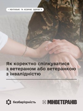 Важливо не змінювати стиль спілкування з людиною лише через те, що вона має інвалідність. У центрі уваги — особистість, а не особливості її тіла. Ветеран чи ветеранка з інвалідністю насамперед залишається собою — з унікальним досвідом, почуттями, почуттям гумору та власною гідністю. Звертайтесь до них так, як звернулися б до будь-кого іншого в подібній ситуації — щиро, відкрито й з повагою.