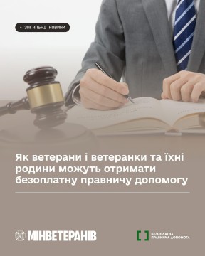 Держава забезпечує ветеранам і ветеранкам війни, а також членам їхніх родин доступ до безоплатної правничої допомоги. Це можливість отримати роз’яснення законодавства простою мовою, консультації щодо прав і соціальних гарантій, а також підтримку у підготовці заяв, скарг і вирішенні питань, пов’язаних із оформленням статусів.