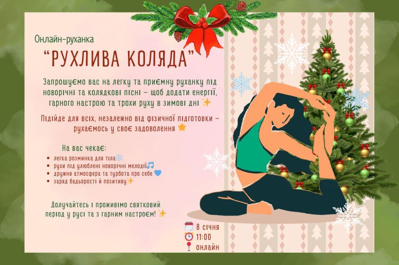 Запрошуємо на онлайн-руханку “Рухлива коляда” — легку розминку під святкові пісні, без поспіху, без напруги, з турботою про себе